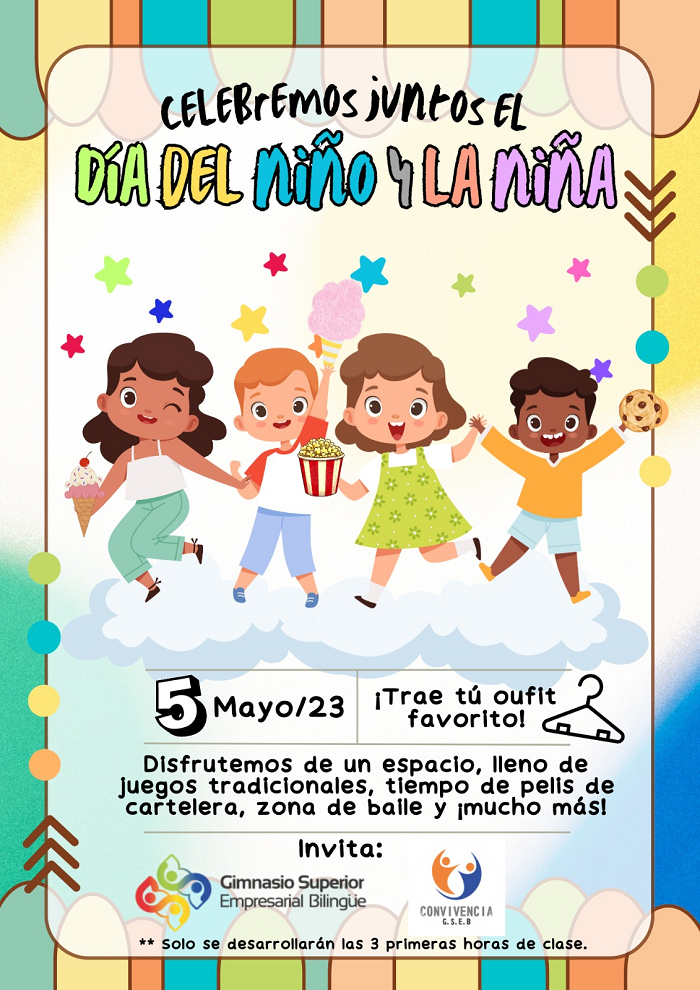 La alegría y la diversión estará presente una vez más este próximo 5 de mayo para celebrar el día del niño y de la niña con nuestros estudiantes de primera infancia y primera División. Los estudiantes asisten en el horario habitual para el ingreso, continúan con sus clases hasta la tercera hora y después del primer descanso, iniciaremos las actividades que tenemos preparadas para su celebración.