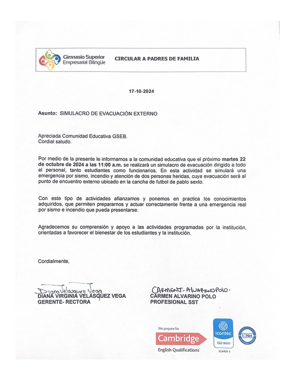 Circular Informativa: Simulacro de Evacuación Externo