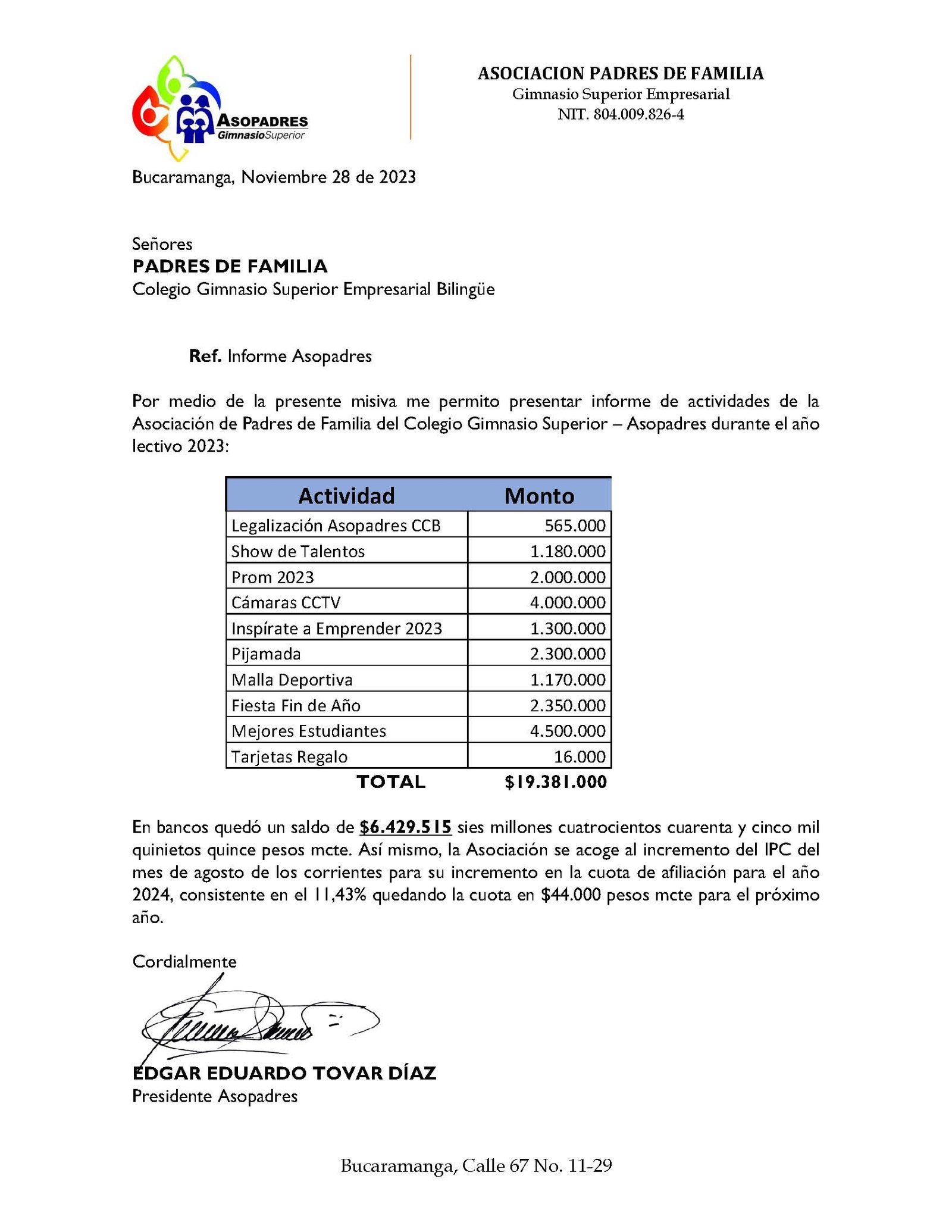 De parte del Colegio Gimnasio Superior Empresarial Bilingüe agradecemos a la asociación de padres por toda su colaboración y majestuosa gestión durante el año lectivo 2023.