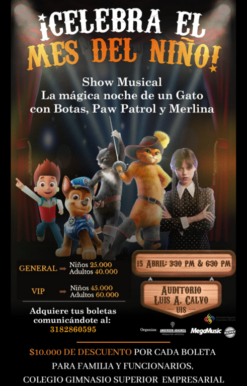 Megamuisc Entretenimiento, tiene el gusto de invitar a los funcionarios y a la comunidad del Colegio Gimnasio Superior Empresarial Bilingüe, para que en el mes del niño hagan parte de un ¡Show Musical para disfrutar en familia!