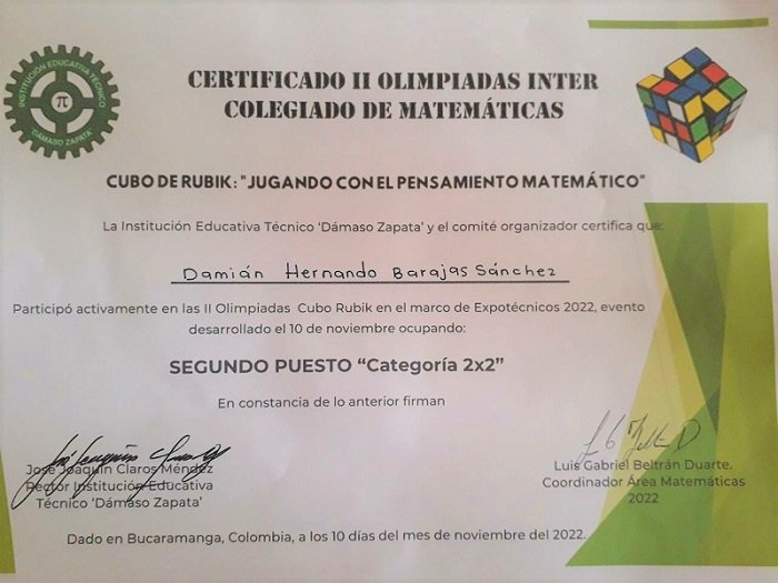 Felicitamos al estudiante, Damián Hernando Barajas Sánchez del grado 7-03 quien obtuvo el 2do puesto en la categoría cubo de 2×2, clasificando a las nacionales en el marco de las Olimpiadas Matemáticas con el Cubo de Rubik “Jugando con el pensamiento matemático”, desarrollada el pasado 10 de noviembre en el Instituto Técnico Dámaso Zapata.