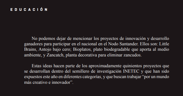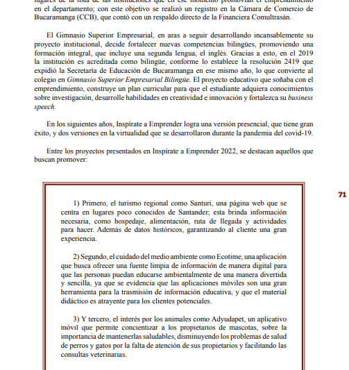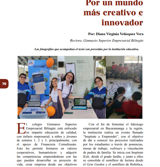Nuestra apreciada Rectora, Diana Velásquez Vega, participó en la sección educación de la Revista Encuentros; en donde exalta los proyectos de emprendimiento de nuestros estudiantes en el marco de ‘Inspírate a Emprender 2022″, espacio creado para dejar huellas que perduren en el tiempo.