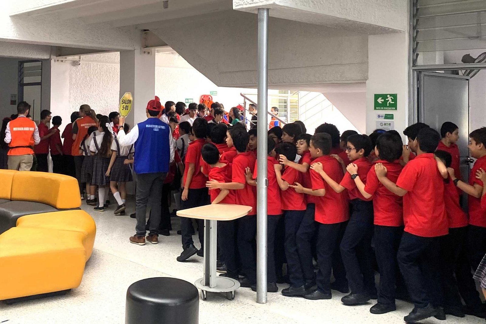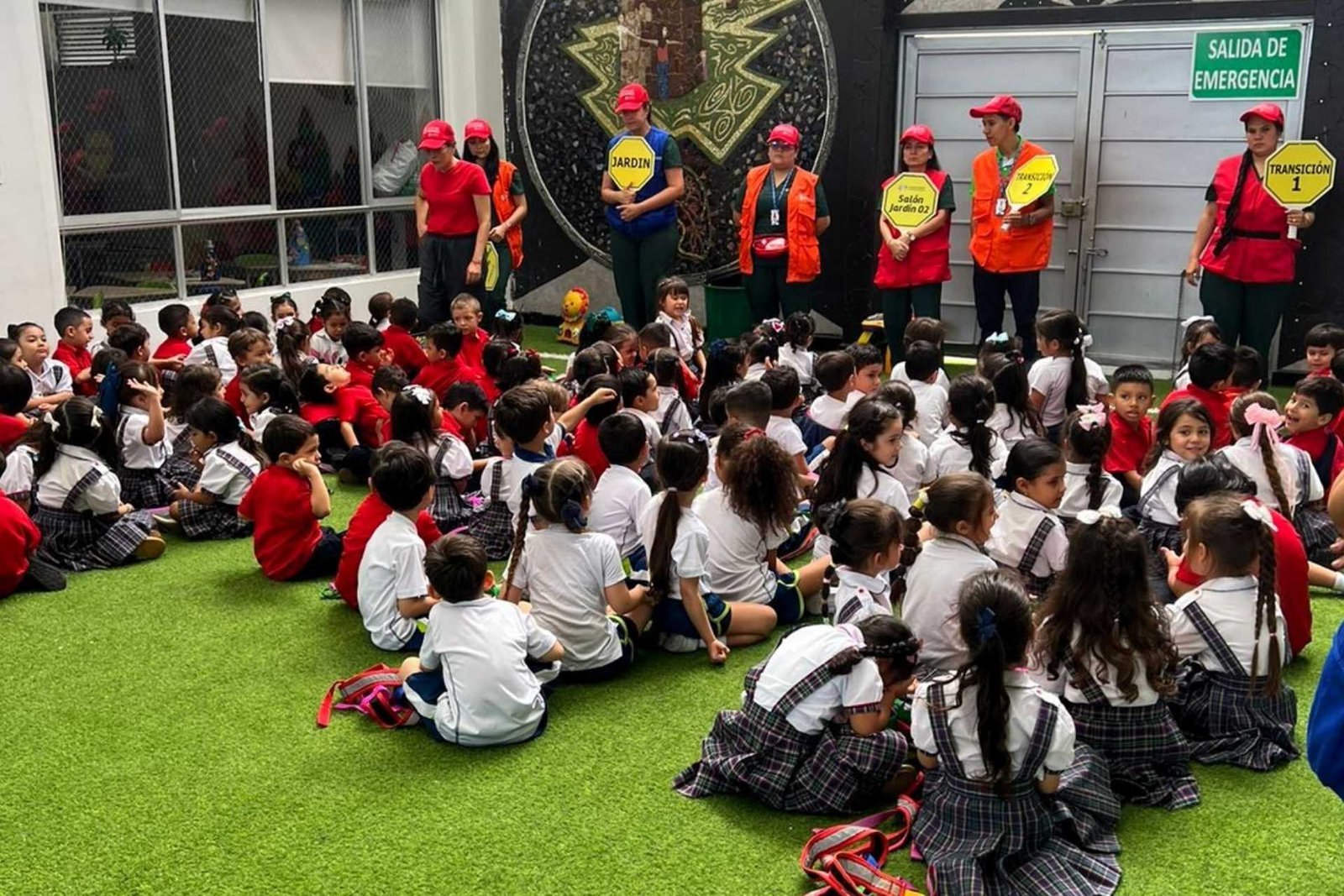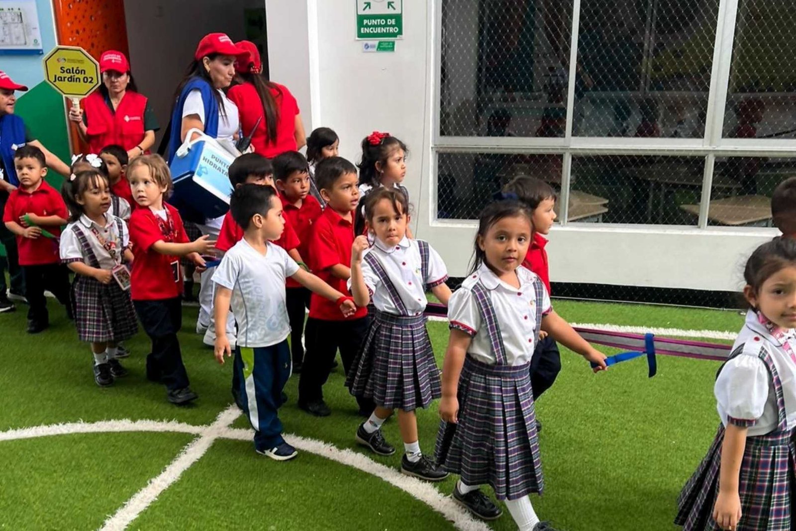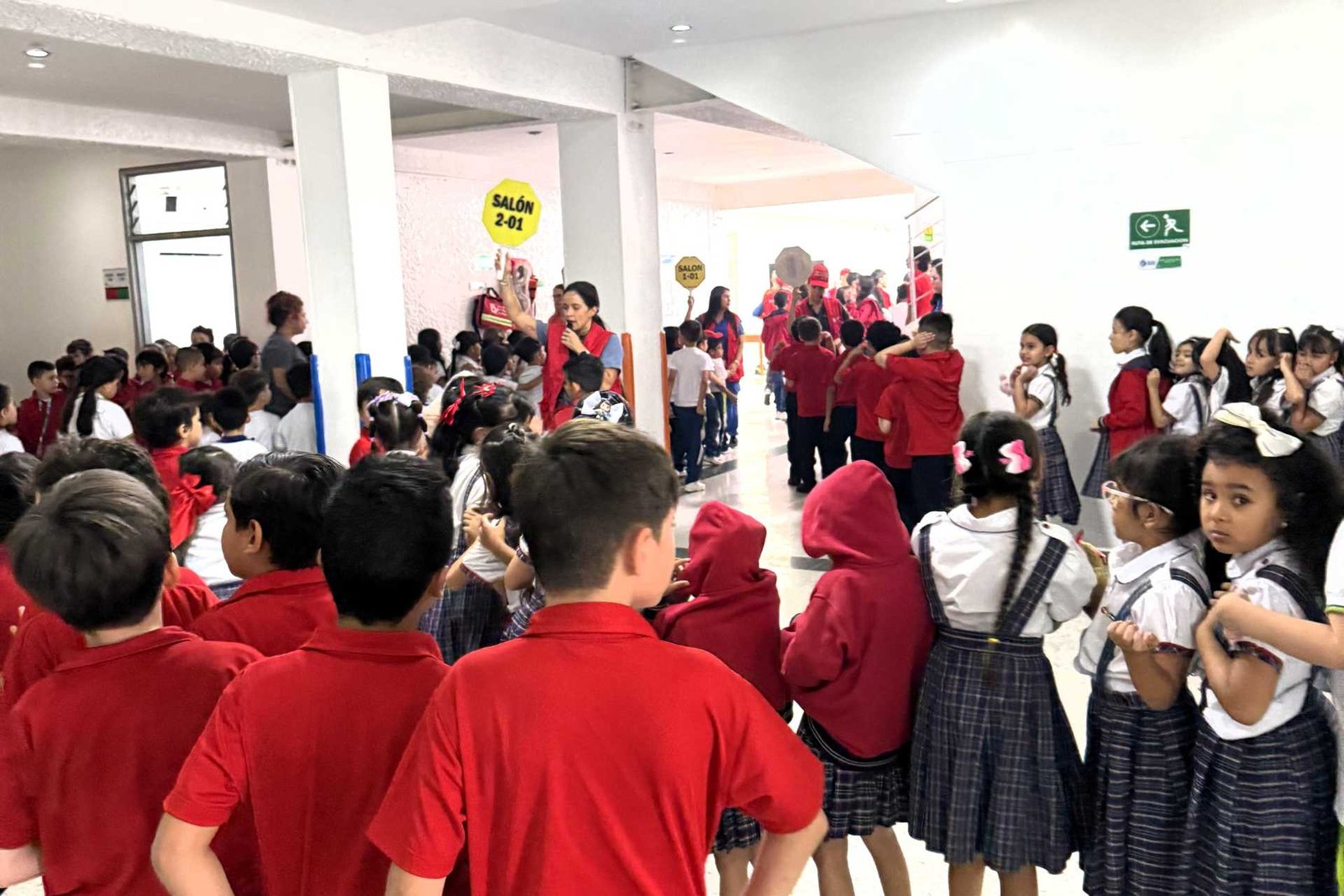 La evacuación organizada de todo el personal del colegio hacia los puntos de encuentro interno.