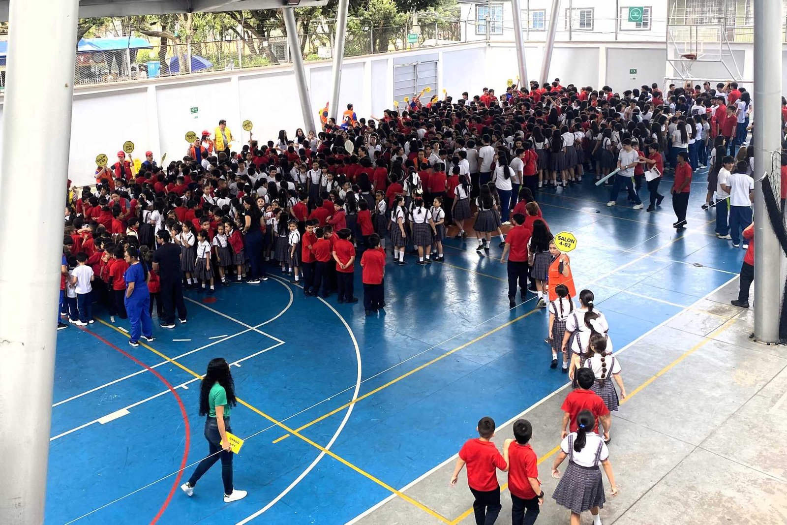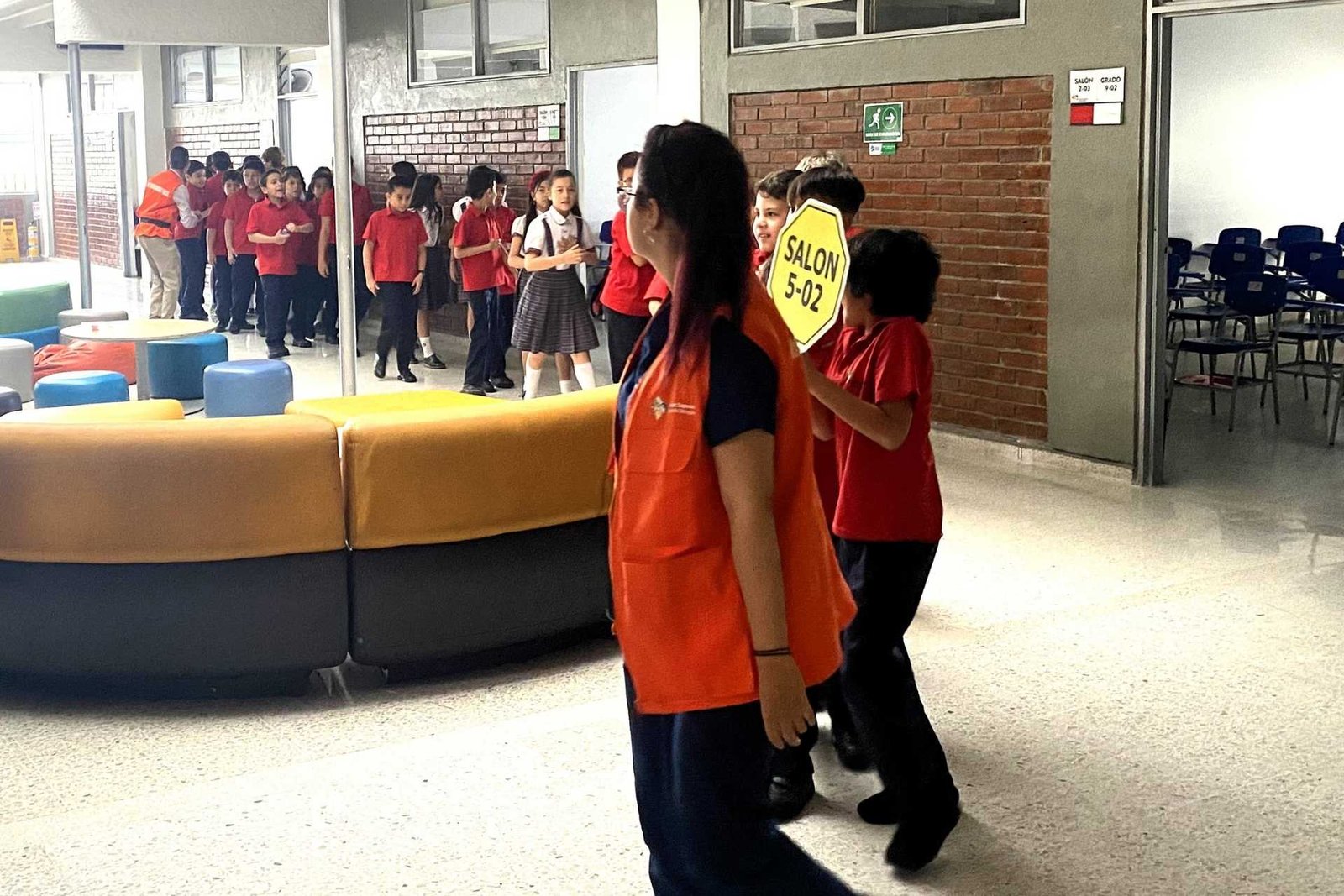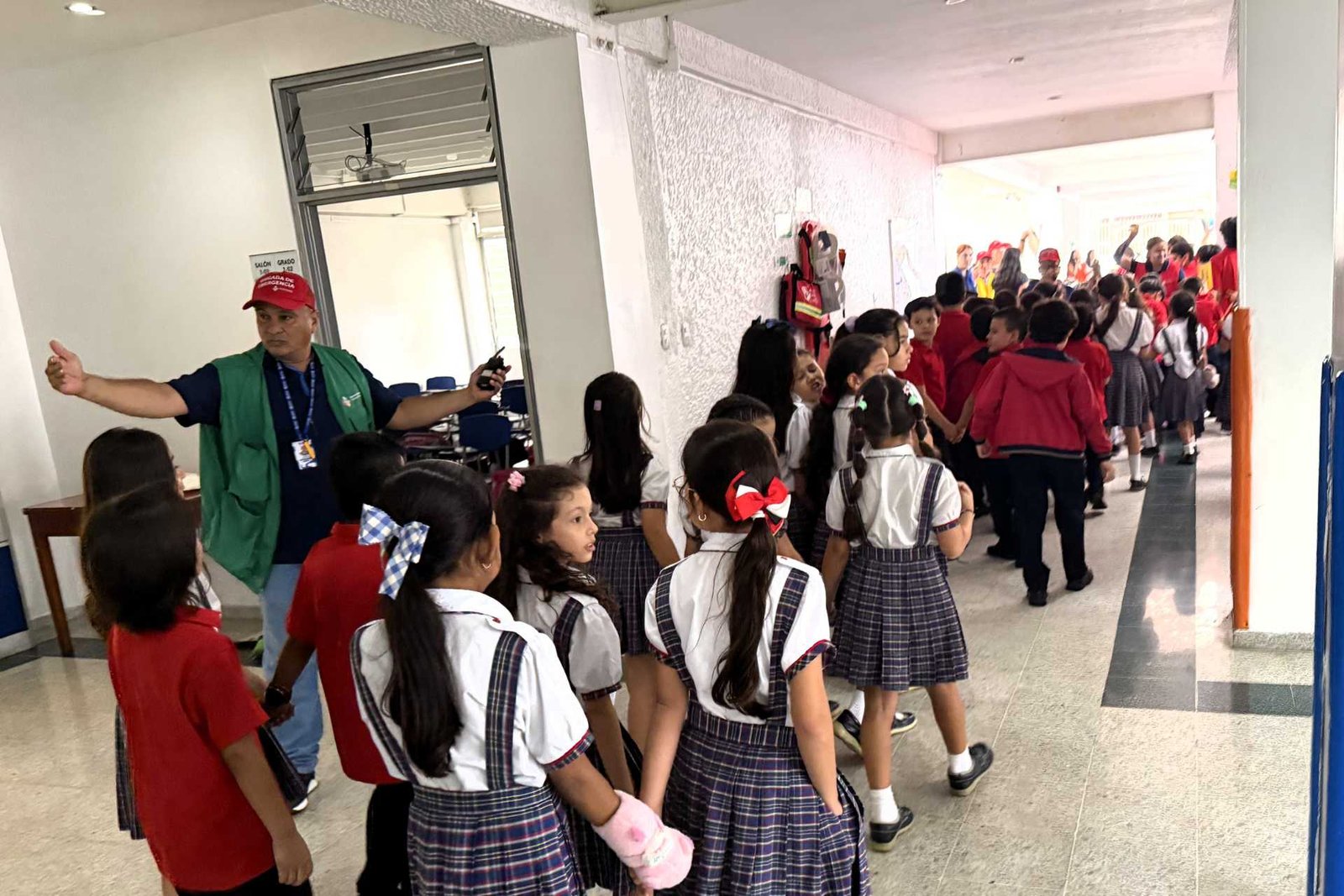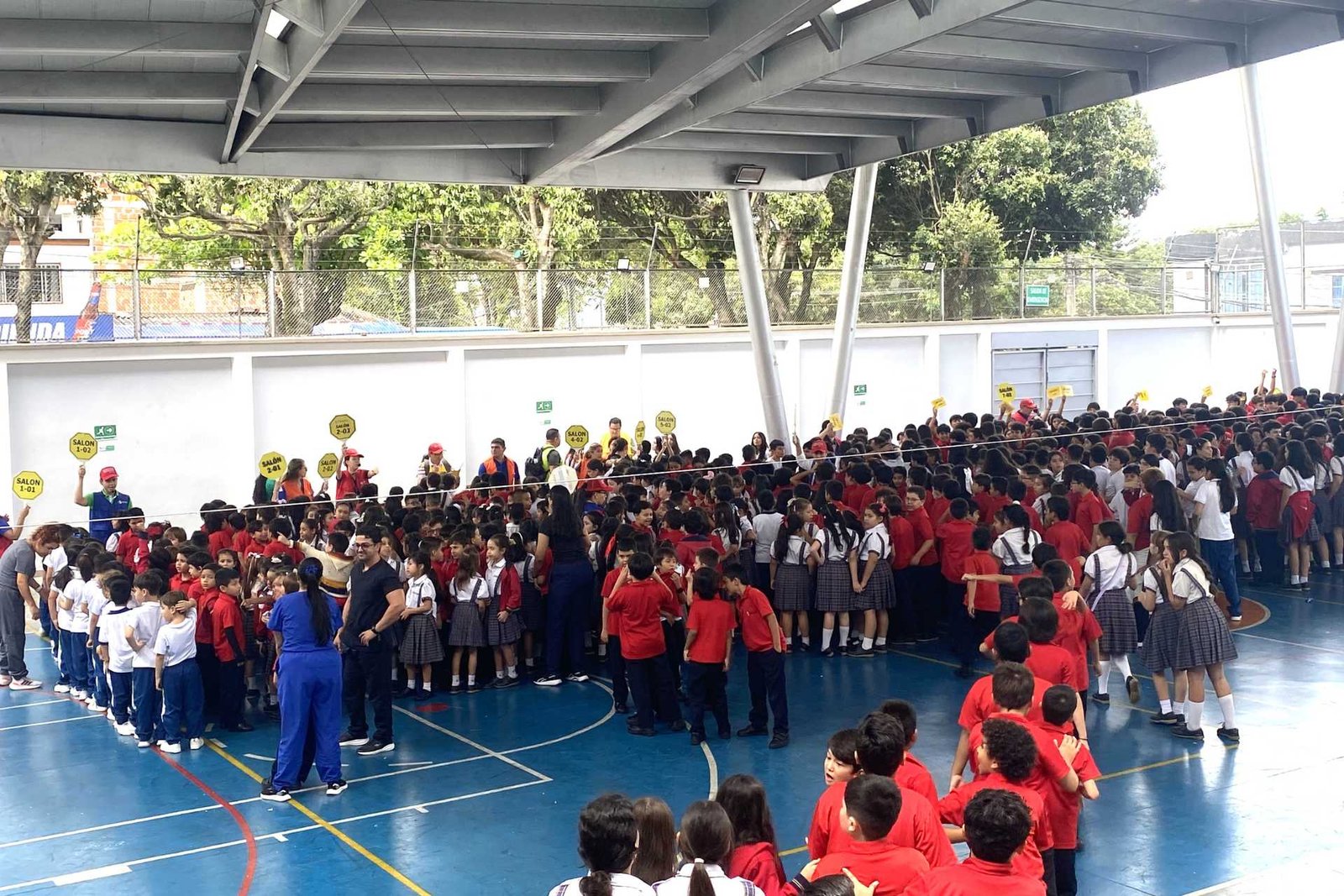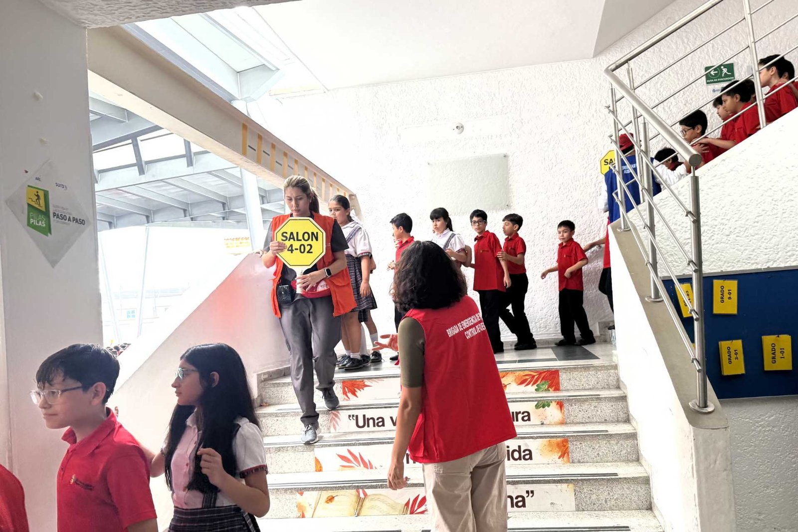 La evacuación organizada de todo el personal del colegio hacia los puntos de encuentro interno.