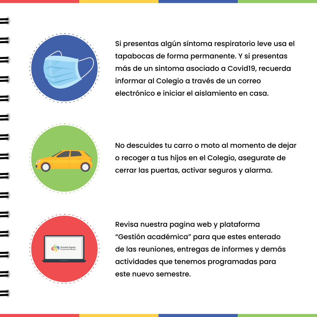 Si presentas algún síntoma respiratorio leve usa el tapabocas de forma permanente. Y si presentas más de un síntoma asociado a Covid19, recuerda informar al Colegio a través de un correo electrónico e iniciar el aislamiento en casa.